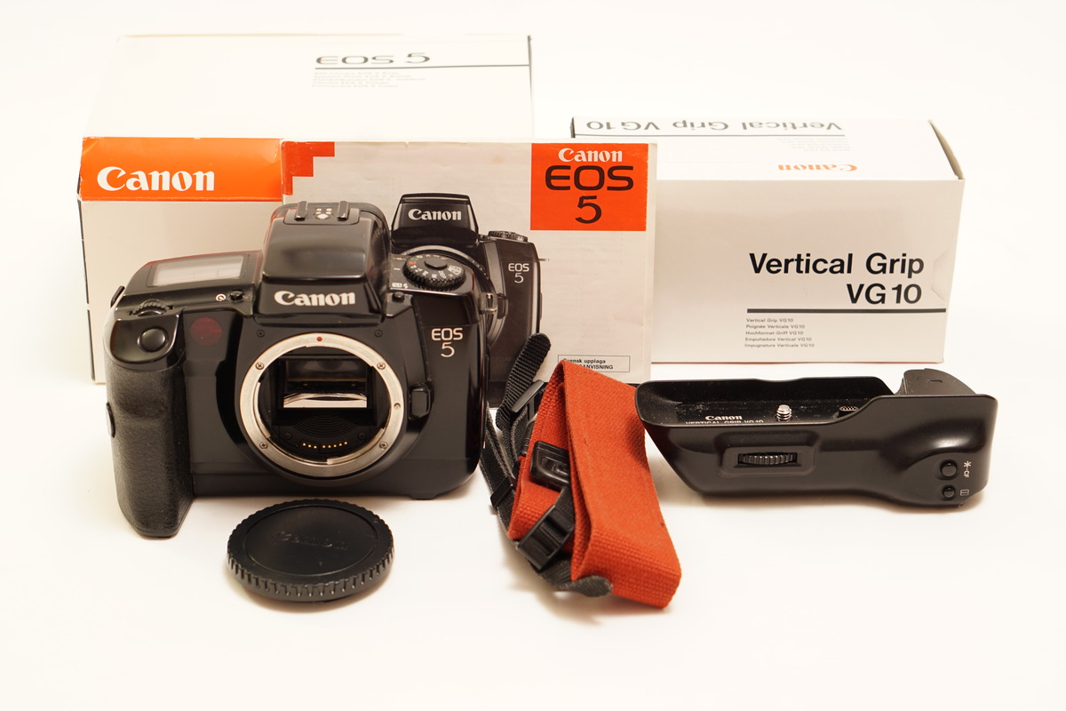 Säljer en Canon EOS 5 analog systemkamera. Kamerahus med tillbehör inklusive rem och vertikal grepp (VG). Originalkartonger. Brukar anses som en av de bästa analoga Canon-modellerna utanför de rent professionella serierna.