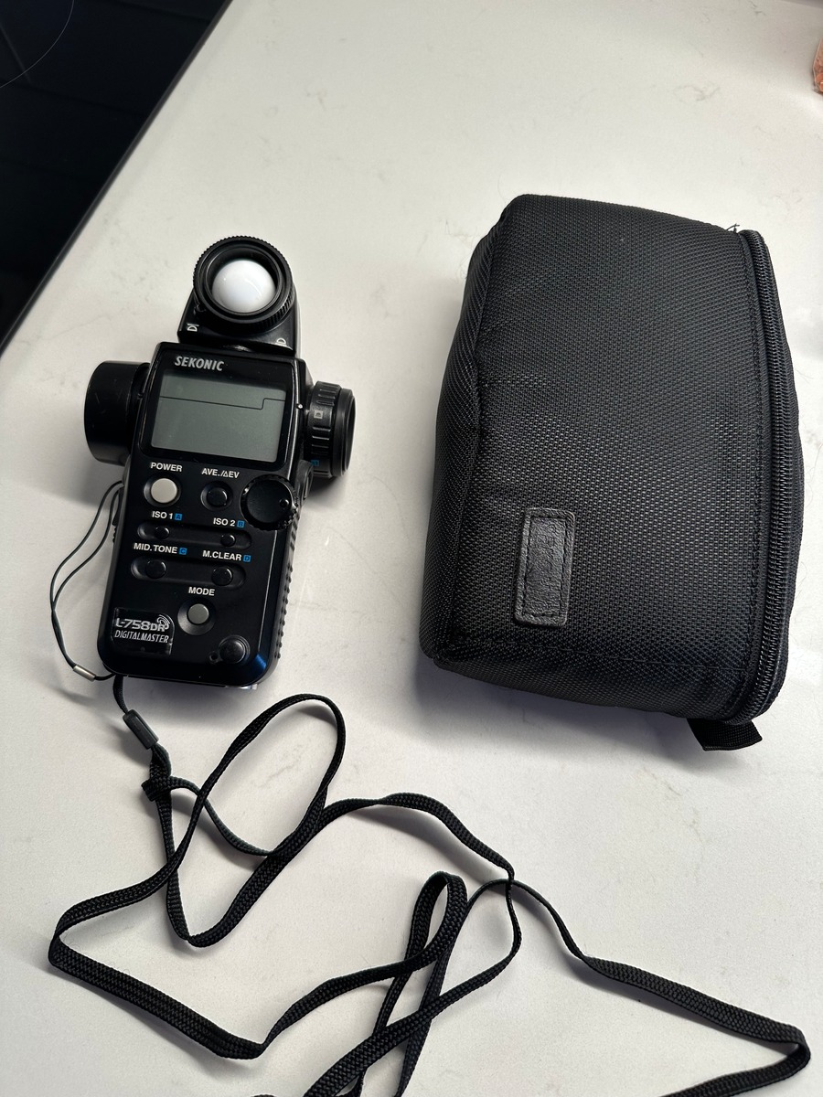Sekonic L-758dr i fint skick. Otrolig ljusmätare, väldigt intuitiv och användarvänlig. Spotmätaren är oerhört exakt och perfekt för svåra ljus, zonbaserad exponering, drama/film och kontrollerad studiofotografering mm.