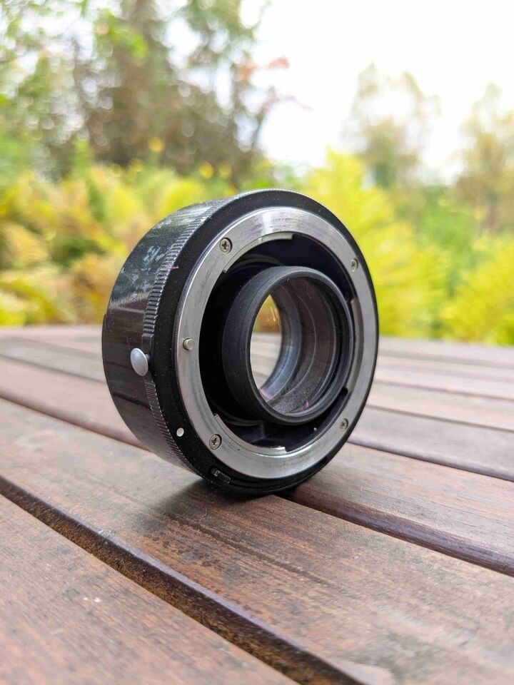 Telekonverter för manuell fokus. Välanvänd, men linsen ser bra ut och har inga repor vad jag kan se i alla fall. Har fått sig en liten törn i metallen av något så har en lite defekt som du kan se på en av bilderna.