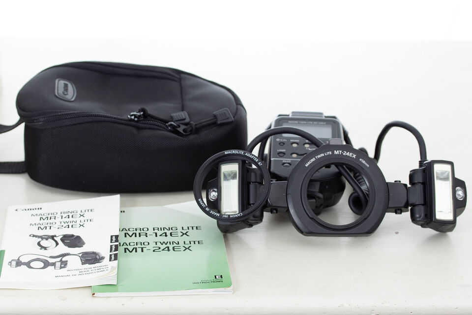 Canon MT-24EX Ver 1 (styrenhet och två blixthuvuden). Macrolite Adapter 67mm: Gör att blixten passar direkt på t.ex. Canon 100mm f/2.8L IS Macro samt mitt Tamron 85mm f/1.8 (se min andra annons). Originalväska: Vadderad Canon-väska. Manualer: Två instruktionsböcker i original. Monteringsring: 58mm standardring.