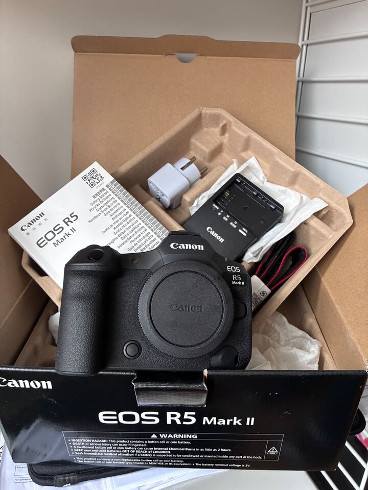 Helt ny R5 MkII. Endast lite uppackad för att känna på kameran. Komplett med alla originaltillbehör: batteri, laddare, kamerarem mm.
