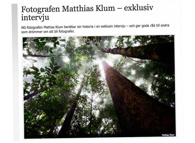 I rollen som National Geographic Fellow stöder Mattias Klum National Geographic Societys naturvårdsarbete, med särskilt fokus på svåra utmaningar inom bio­logisk mångfald och djur- och naturvård. I samband med detta har National Geographic gjort en intervju med Mattias Klum. Den kan du läsa här.