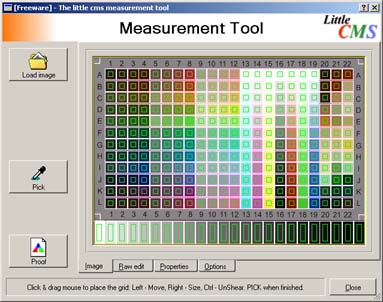 Steg 2 -- extrahera mätdataLäs in bilden med qtmeasurementtool. IT8:or skiljer sig lite i utseende så vi får tala om vilken typ av IT8:a som vi använder. Det gör vi genom att välja en lämplig ''Template'' under fliken ''Options''. Fausts IT8:or beskrivs som IT8.7/2-22. Sedan går vi tillbaka till fliken ''Image''. Över bilden har det nu dykt upp ett rutmönster som ska matchas över bildens mönster. För att göra detta använder vi höger och vänster musknapp. Om bilden skulle råka vara sned så kan även rutmönstret snedställas med hjälp av ctrl-knappen. När vi är nöjda så klickar vi på ''Pick'' och sparar den genererade mätdatan.