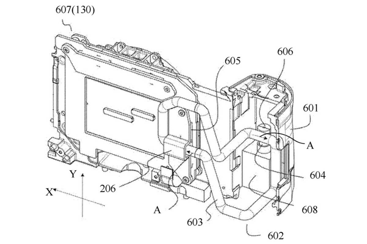 Canons patentansökan visar en kylkrets som leder bort värmen från sensor, batteri och minneskort till andra delar av kameran. Själva vätskan är magnetisk. Det gör att den kan ledas runt i det slutna systemet med hjälp av en elektromagnetisk generator.