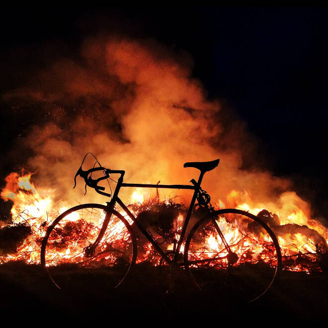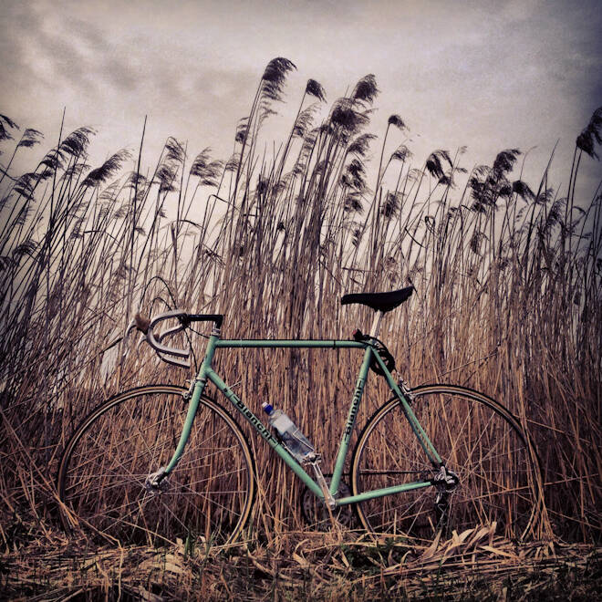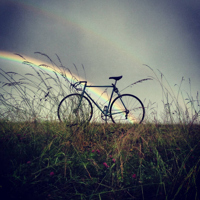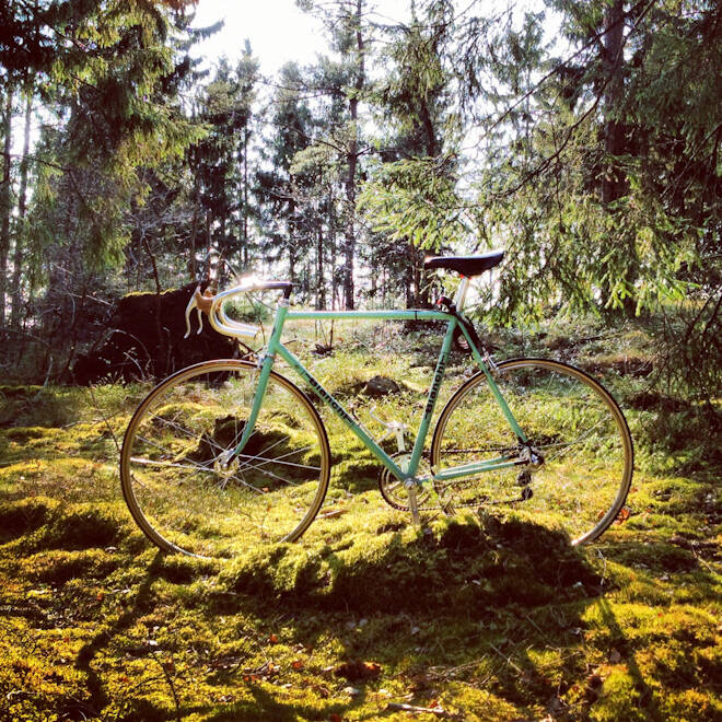 − Den fick jag på köpet när jag en tidig lördagsmorgon bestämde mig för att köra Stockholm – Göteborg på min gamla celeste-färgade racercykel. Jag älskar naturens mönster, vyers färg och det fantastiska ljuset allt badar i ibland, även om det kan bli lite mycket solnedgångar och dubbelregnbågar idag. I kontexten av en resa och de många ställena man kan placera en veterancykels rena former tycker jag det blir lite roligare. Samtidigt är bilderna bara sekundära, de är egentligen bara ett resultat av mina resor och sådant jag råkar se som jag vill minnas.