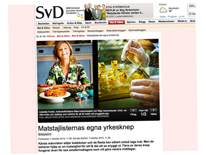 I en artikel på Svenska Dagbladet delar matstylisten Liselotte Forslin med sig av sina egna yrkesknep. Här finns allt från nålar till vaselin och en droppe diskmedel för att få maten att se fräschare ut på bild.