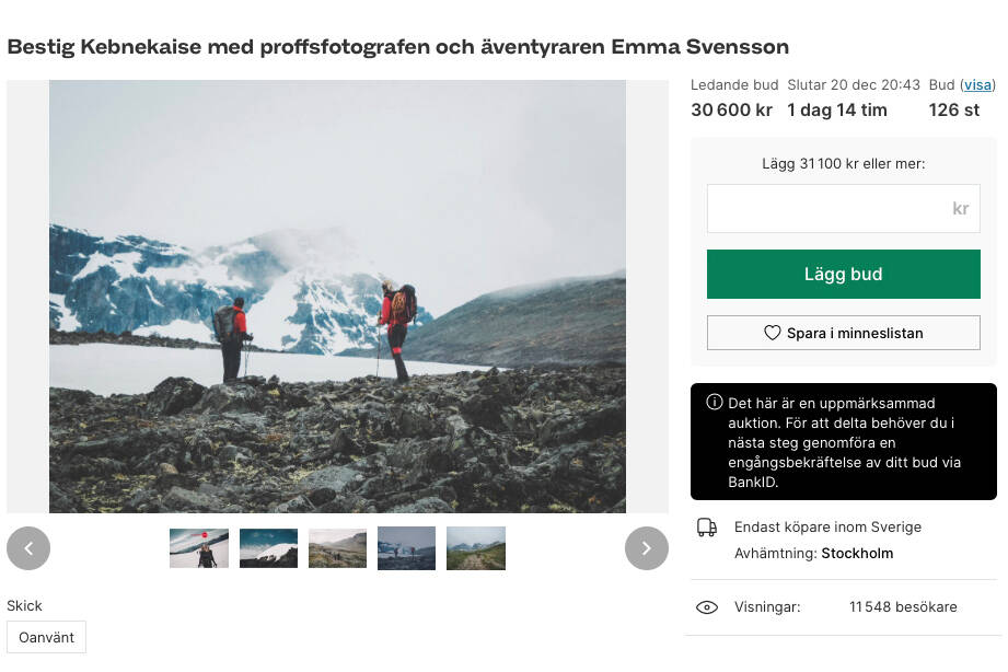 Och en del fotografer är med och samlar in pengar, framför allt på Tradera där man kan bjuda på en del fotorelaterat. Den som är sugen på lite äventyr kan buda på att bestiga Kebnekaise med proffsfotografen och äventyraren Emma Svensson. Man kan vara med och buda på ett signerat fotografi av Joakim Thåström, taget av Eva Dahlgren och en limiterad fotoutskrift av Hällingsåfallet i Jämtland av fotograf Philip Slotte.