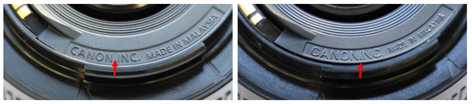 Så här skriver Canon: "The company name is shown in either printed or molded letters (two types exist)."
