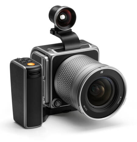 Kombinationen av kamerahus, silverfärgat objektiv och optisk genomsiktssökare påminner starkt om en av företagets klassiker, supervidvinkelkameran Hasselblad SWC (Super Wide Camera). Den tillverkades i olika versioner under flera decennier och var berömd för sin skarpa och raktecknande supervidvinkel som är fast monterad på kamerahuset.