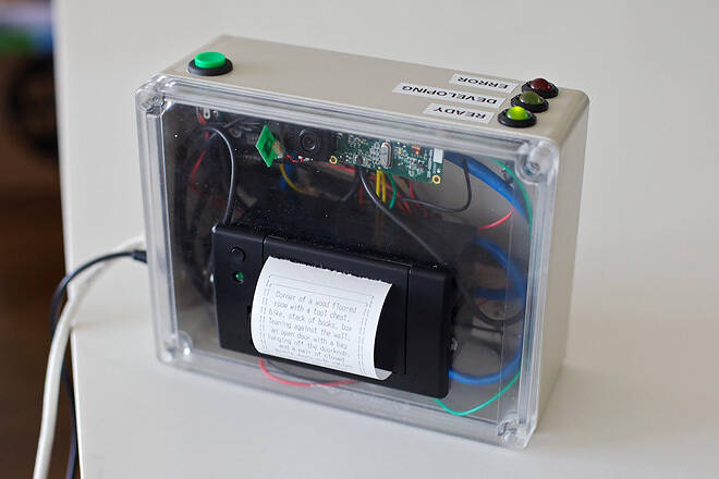Datorer klarar ännu inte att beskriva innehållet i en bild. Därför laddas bilden från kameran upp på Amazons onlinetjänst Mechanical Turk där folk mot en betalning på cirka 8,50 kronor beskriver bilden. Under tiden kameran väntar på en beskrivning av bilden lyser en stor lampa märkt ”developing” (som i att framkalla film). När "framkallningen" är klar skrivs beskrivningen ut på en kvittoskrivare.