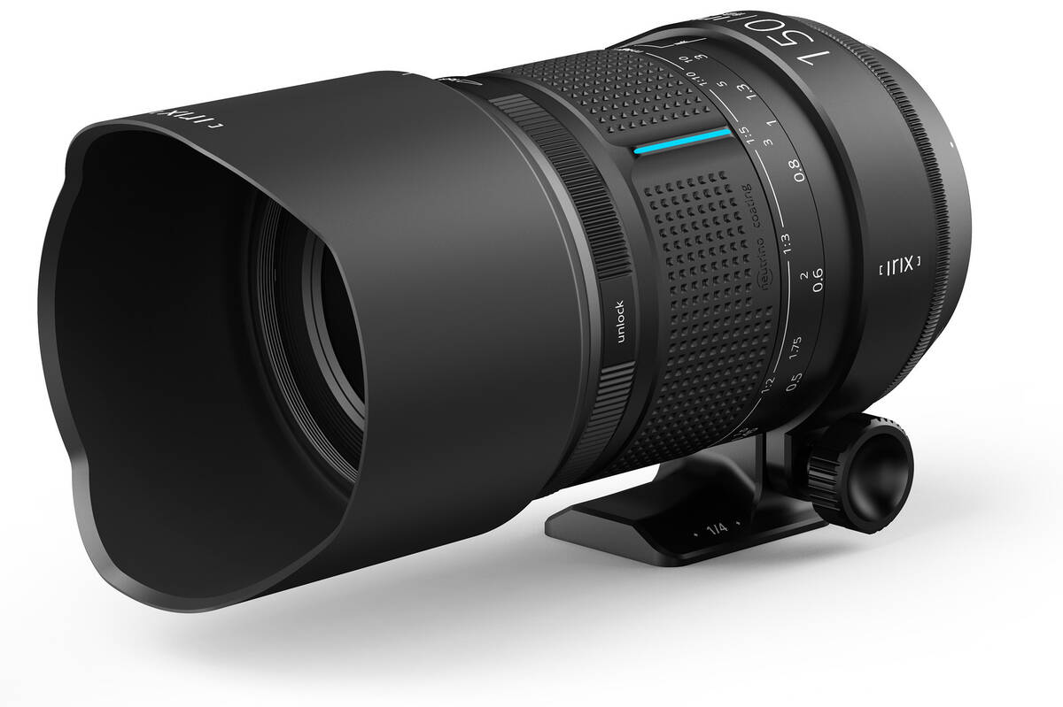 Irix 150 mm f/2,8 Macro 1:1 levereras med ett kraftigt motljusskydd och ett roterbart stativfäste som har en Arca Swiss-kompatibel fot.
