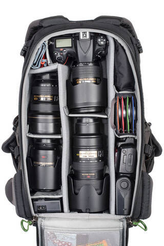 Det finns flera yttre fack. Det stora kamerafacket är åtkomligt från ryggsidan. Det gör att man inte behöver lägga ryggdelen nedåt för att komma åt prylarna. Mindshift gear uppger att det ryms en spegelreflexkamera med 4-6 objektiv samt blixt. Längsta möjliga objektiv är en 200-400/4.