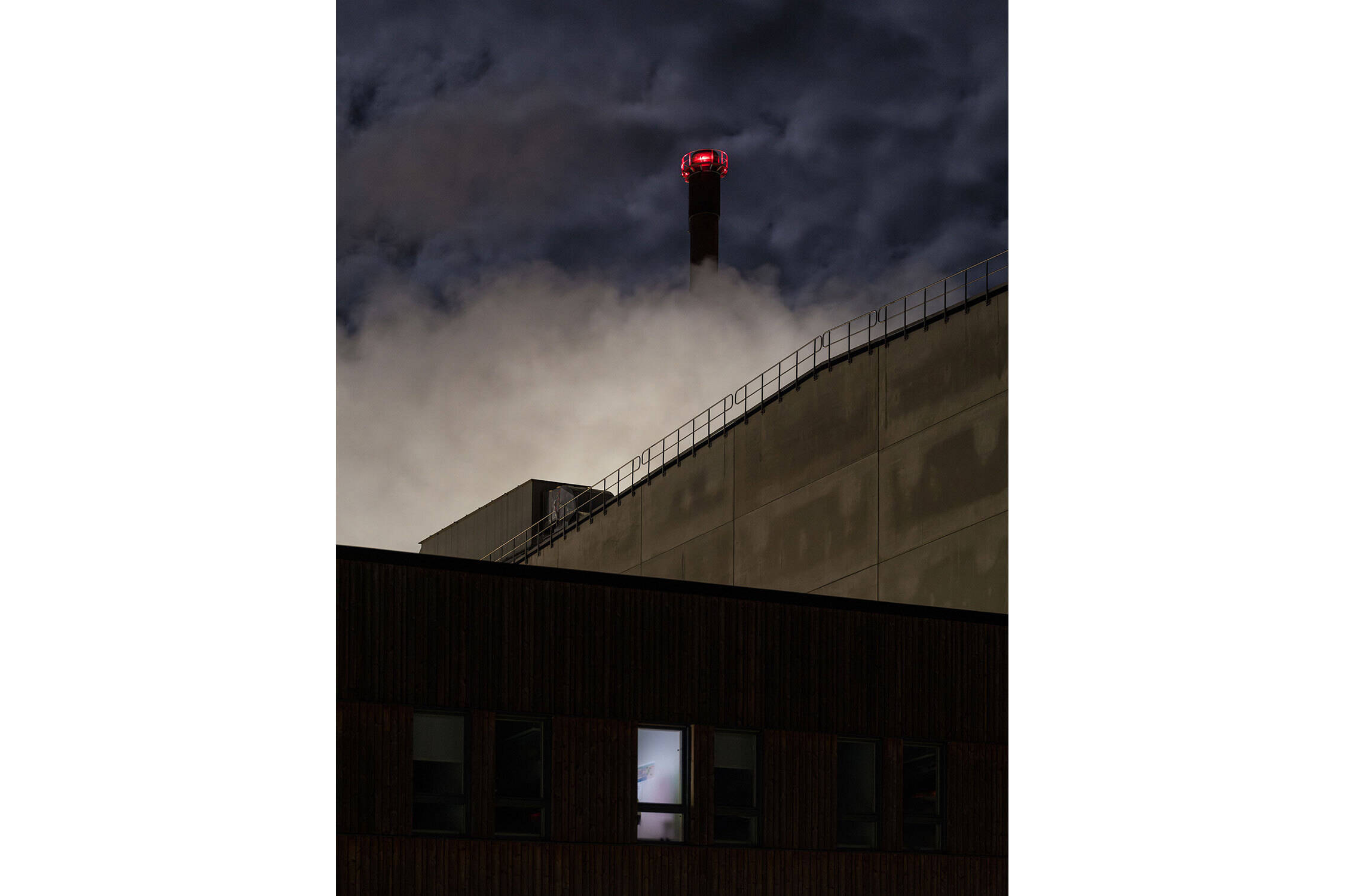 Markus Naarttijärvi vinner kategorin Ariktektur för sin bild av pappersbruket i Obbola, Sverige, omgivet av lager av skuggor, betong och moln under en mörk novembernatt.