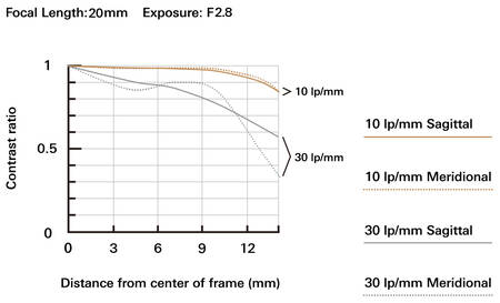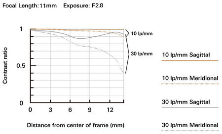 Den optiska konstruktionen består av 12 linser i 10 grupper. Närgränsen är 0,15 meter vid 11 mm brännvidd och 0,24 meter vid 22 mm. Det ger avbildningsskala 1:4 respektive 1:7,6. Bländaren har 7 blad.