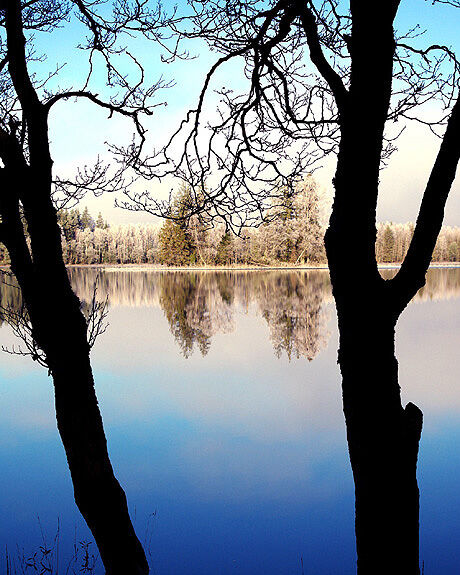 Vinterdag vid nordisk insjö. Copyright © Grönavågen