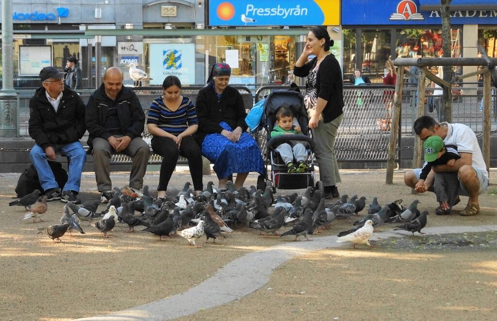 Att mata duvor i parken. Copyright © Leyman