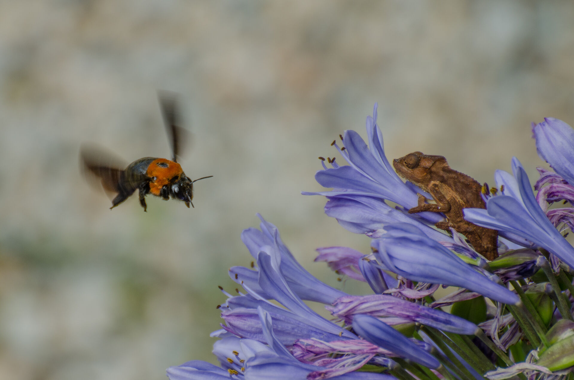 Tävling > Fotosidan Masters 2015 - Etapp 1 (Ögonblick) > Humla och Kameleont i Knyssna, Sydafrika