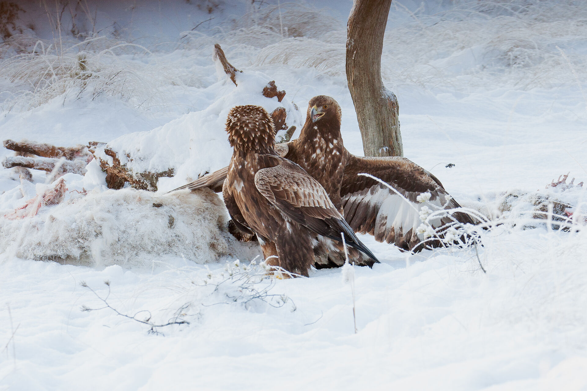 Två kungsörnar bråkar om maten. Copyright © Alaskajoe