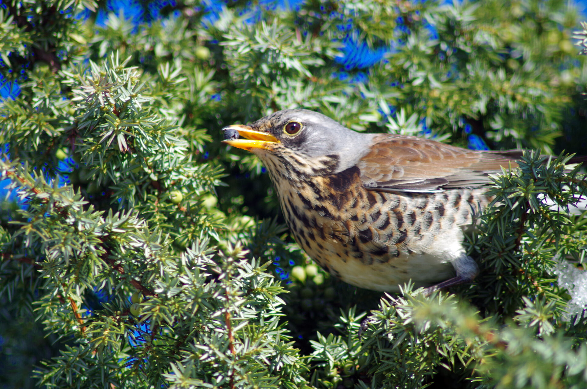 Tävling > Fågelporträtt | Vinst från Crimson > Björktrasten har hittat ett mumsigt mellanmål