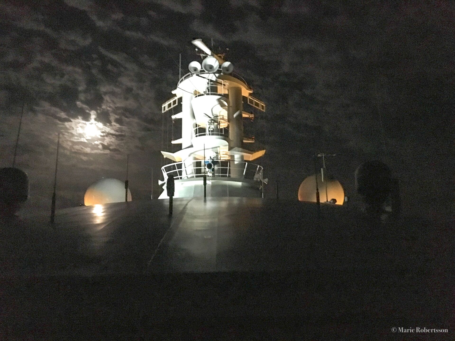 Radarutrustning på ett kryssningsfartyg. Taget i fullmåne mitt i natten. Copyright © Mimmi2767