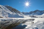 Morgonens första solstrålar över glaciärsjön