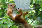 ekorren äter från fågelmataren