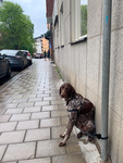 Hund som hukar under regnet