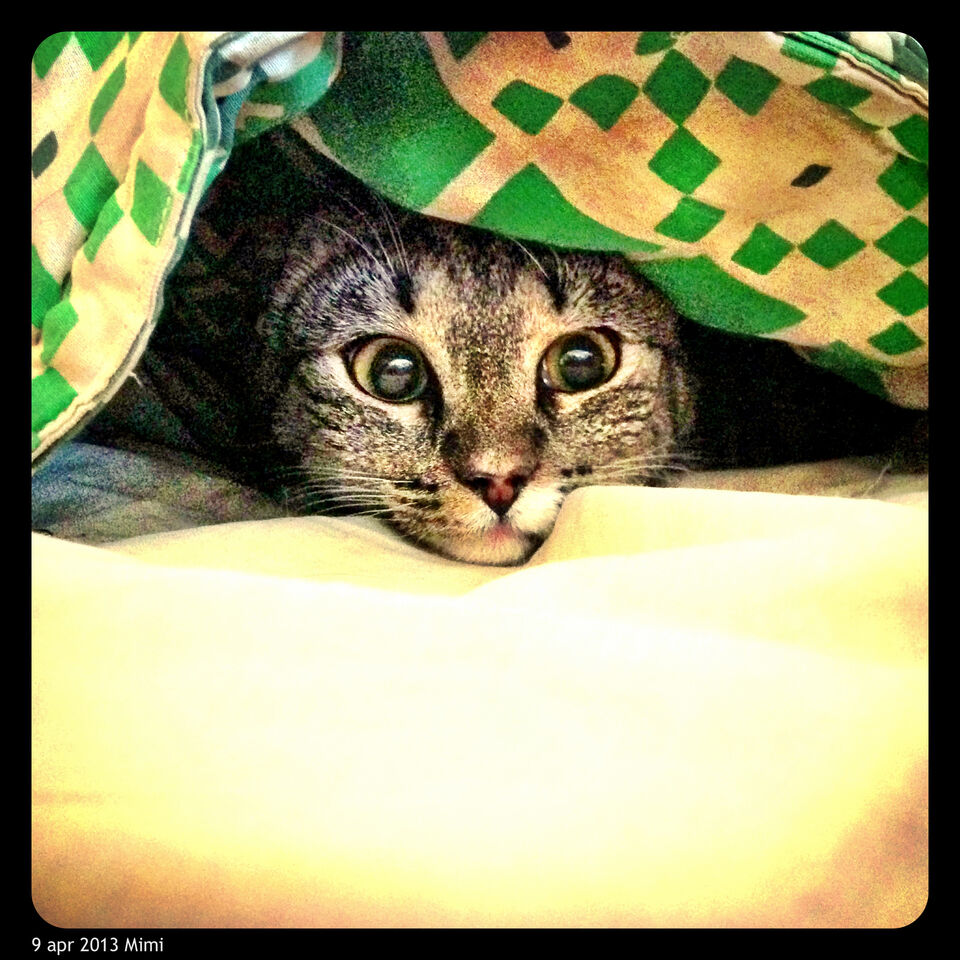 Mimi tycker om att leka under täcket