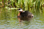 Gråhakedopping med unge på ryggen.