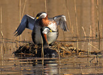 Gråhakedoppingpar vid redet efter betäckningen - honan med lyfta vingar