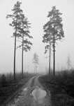 Skogsväg i dimma sv