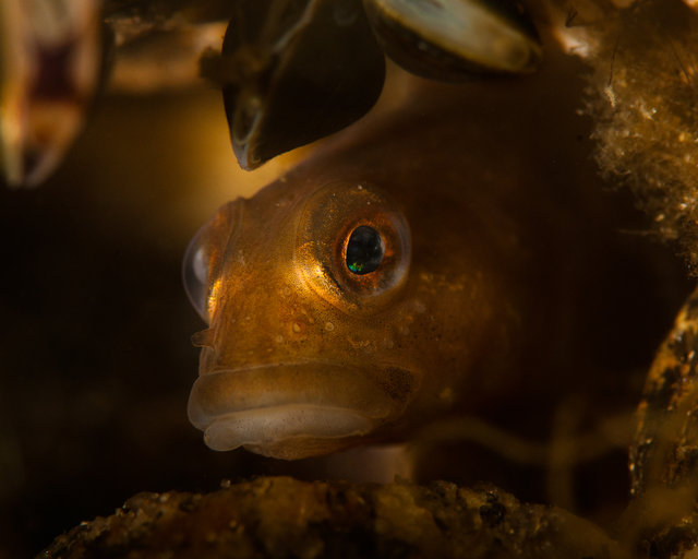 En bild som blir bättre och bättre ju längre man tittar - ett mycket fint fiskporträtt! Belysning med snootblixtar är svårt och det tar ofta många försök innan det kommer några lyckade bilder. Alldeles för ofta brukar fiskarna smita iväg innan belysningen är på plats och motivet i fokus. Men om det lyckas går det att, som i denna bild, skapa intressanta bilder med genomtänkt belysning som drar betraktaren till motivet. Jag gillar den riktade belysningen och bronsaktiga färgen som går igenom i bilden. Dessutom har fotografen lyckats skapa en fin kontaktkänsla med fisken och ett fint blänk i ögat.