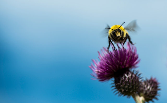 Kul bildtext. Så bra att fotografen inte lyckades med projektet: bilden vinner på att vingarna har rörelseoskärpa, det gör att humlan ser levande ut. Påpassligt att fotografera precis när humlan övervunnit sin tyngd och lyfter från blomman. Kompositionen är ovanlig, vilket är bra. Den här bilden hade blivit trist om motivets centrerats eller placerats enligt tredjedelsregeln. Nu känns den både konstnärlig och grafisk.