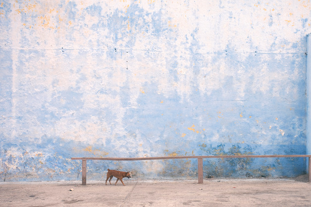 Jag håller inte med om att fasaden är huvudmotivet - det är ju hunden! Han har väntat in precis det rätta ögonblicket. Delarna runt om tillför olika saker till bildens berättelse, som den lilla kanten längs högra sidan, där man ser att det finns en öppning mot ljuset i överkant. Och den där väggen! Man skulle kunna ha den som porträttbakgrund resten av sitt liv.
