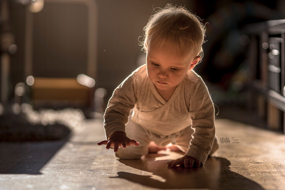 Beskrivning: Detta foto på min dotter är taget hemma i vår lägenhet i Uppsala. Ljuset kommer från starkt direkt solljus genom ett fönster bakom henne och studsar sedan mot parketten och lyser upp hennes ansikte tillräcklig mycket. Hon upptäckte sin egen skugga och leker sedan med den. Jag var lyckligtvis snabb med kameran och lyckades fånga detta härliga ögonblick. |