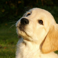 är en goldenvalp som står på bakbenen.