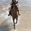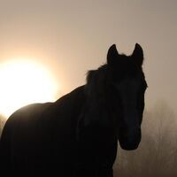 En häst travar i sin S-form över en sanddy. Man ser den som silhuett mot en stor sol vid toppen. Det är min drömbild om den någonsin slår in..