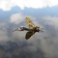 Det är nog fortfarande min bild på Sjösandsländan som precis har kläckt så att man fortfarande kan se nymfskalet hängandes i ytfilmen. Jag hade en ruskig tur där med tajmingen.
