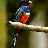 En quetzal på en mossig gren med bromelior i dimmigt morgonljus, en solstråle silar igenom och träffar fjäderdräkten som glittrar som ädelstenar.