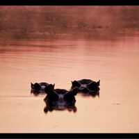 Flodhästmorgon i Krugerparken med 50-talet brölande morgonpigga "hästar". En termos kaffe, annars helt ensam...
