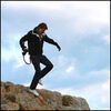 Flickvännen Rebecca på en trottoarkant i skräddarställning, tagen frammifrån, tittandes till vänster. Grodperspektiv. Sv/v.