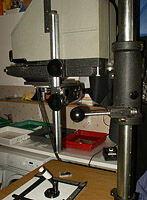 Kondensorapparat med opallampa samt speciellt kalljusagregat som alternativ. Tillverkad på 1950-talet. Stort huvud för negativ från 24x36mm - 13x18cm. Kraftig pelare och fotstativ med metallhjul för ...Läs mer