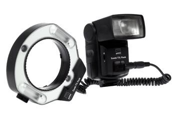 Makroblixten som monteras på objektivet är roterbar och består av 2 små blixtar på varsin sida. Man kan välja om bara en sida ska blixtra eller bägge samtidigt, eller ingen alls. Den har även hjälpbelysning för autofokus.