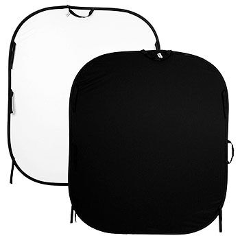 Dubbelsidiga bakgrund i storleken 1.5 x 1.8 m. Två bakgrunder i en. Denna modell är vit på ena sidan och svart på andra sidan. Denna bakgrund är rektangulär med rundade hörn och har ett starkt stålband insytt i kanten. Detta gör den självstagande så att de kan lutas mot vägg eller hängas eller fästas i hållare. Hopvikta är den ett platt paket i 1/3-storlek. Fodral medföljer.