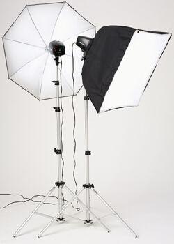 ett kit med två FalconEyes SS110B samt två stadiga stativ 240cm och ett vändbart paraplysilver/vitt 60cm samt en softbox 45x45cm.SS110B har steglös blixtinställning 1/1-1/8 dels effekt