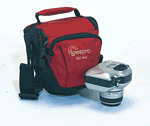 I denna klämmer jag ner min Nikon D100 med en 24-120VR-glugg. Då blir det trångt vill jag lova! Verkligen precis så det går, vi får se hur länge dragkedjan håller.