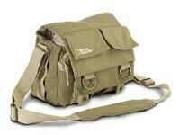 Medelstor axelväska i khakifärgat, grovt tyg. Plats för en systemkamera med monterat mindre objektiv samt extra objektiv/blixt. Lock med både knäppfäste och dragkedja, samt två mindre fickor fram.