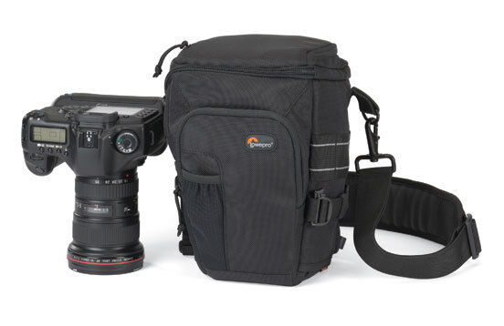 Denna väska finns i tre storlekar (detta är mellan storleken) och passar min Canon 5D med 24-70L objektiv (funkar sannolikt även med batterigrepp). Det finns en sele som extra tillbehör för att bära den på magen (medföljer ej), men remmen som följer med går att använda för att fästa väskan på bröstet på ett tillräckligt bra sätt, så jag har ännu inte sett något behov av den extra selen.