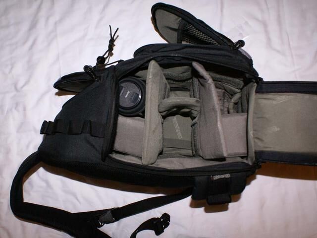 Liten och smidig, men kan dras ut (dragkedja) så att även en laptop kan få plats. Objektivfacken är variabla med kardborre. (9st finns som max) med lock. Förutom detta så finns det ett stort fack där man skulle kunna lägga kameran, om man inte lägger den i det mittersta objektiv facket. Ett mindre fack finns även för tunnare saker.