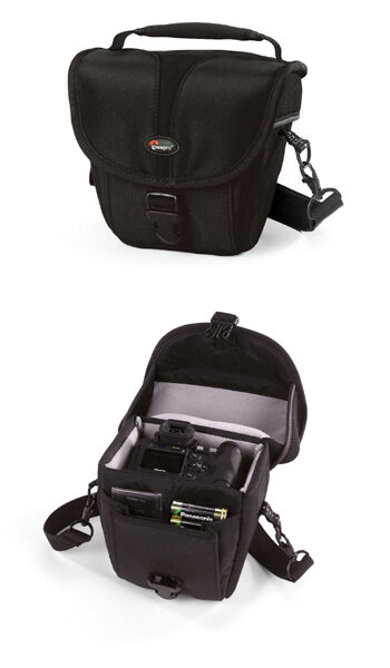 PLUS: Liten och lätt väska med stabilt snäpplås. Neopren på bärhandtaget ger mjukt och bra grepp. MINUS: Det lilla yttre facket går inte att dra igen, batterier och minneskort trillar lätt ur.